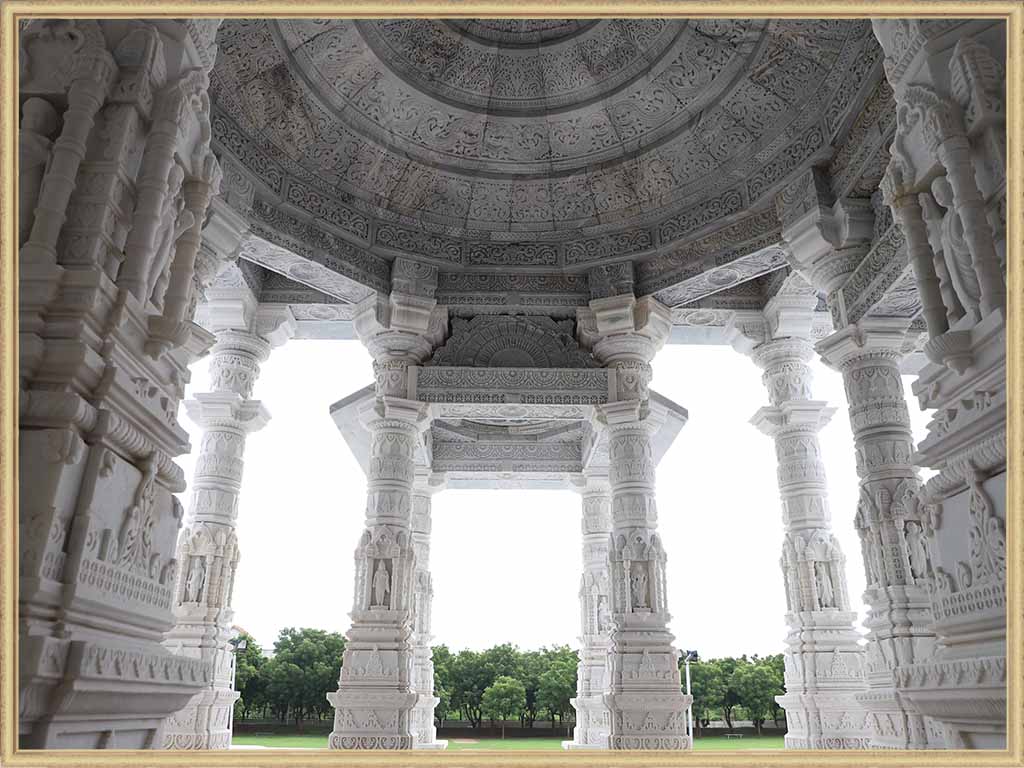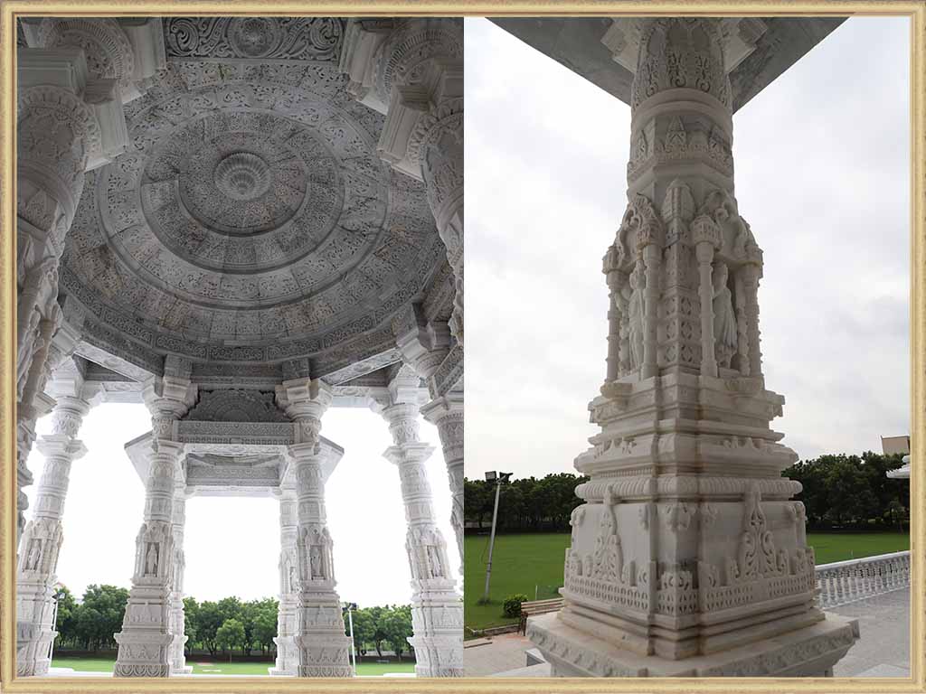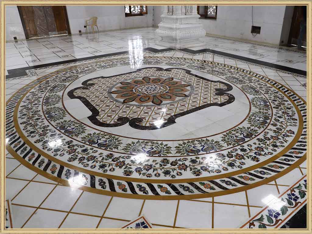 આરસમાં Inlay દ્વારા કોતરણી કરીને મંદિરની બહારની દીવાલો પર તપસ્વી નીલકંઠવર્ણી તથા સંગીતમય પરમહંસોની મૂર્તિનાં અલૌકિક દર્શન થાય છે તો ભાતભાતની Inlay રચનાઓ દ્વારા સુશોભિત મંદિરની Flooring અહોભાવ પ્રેરે છે.
