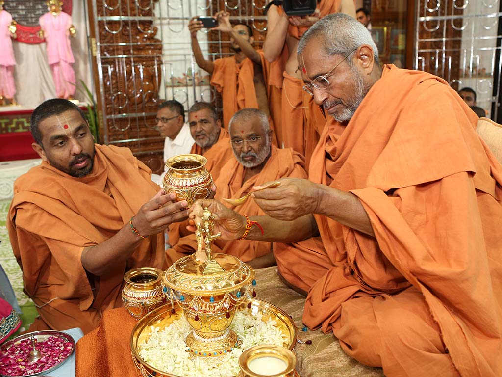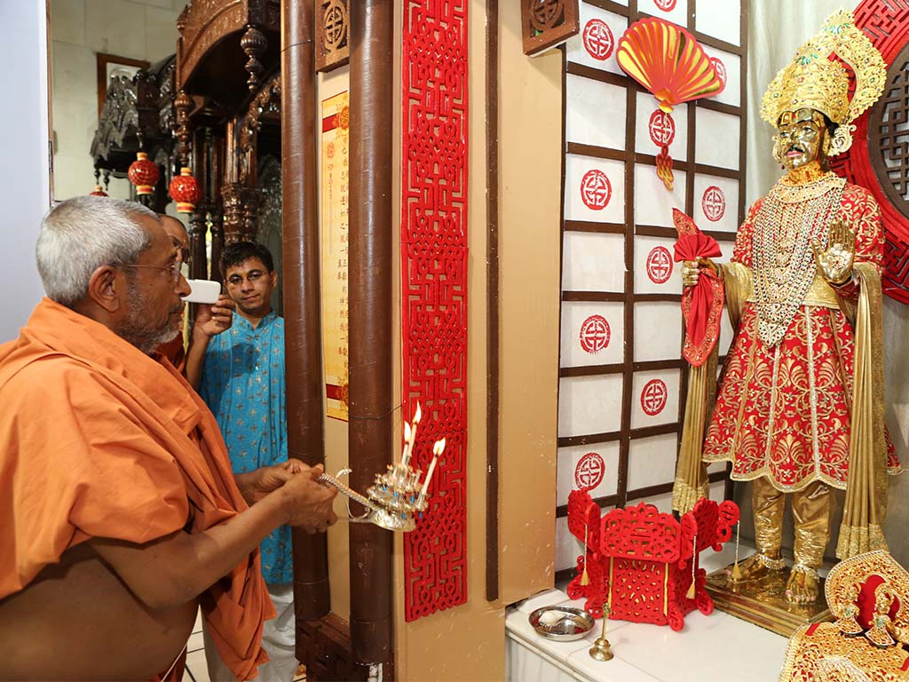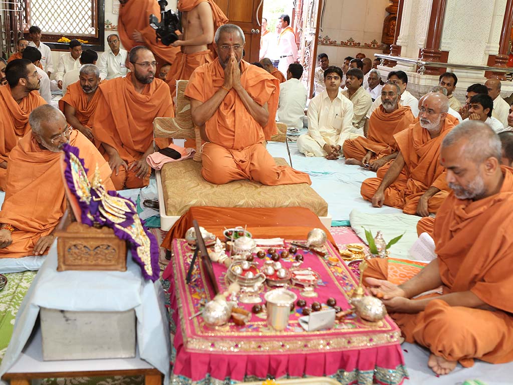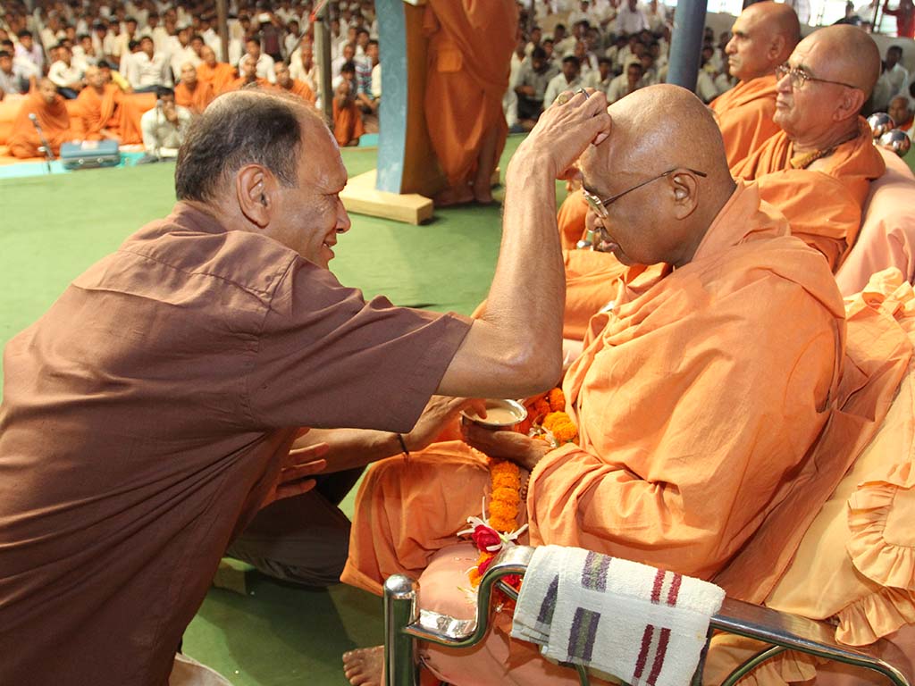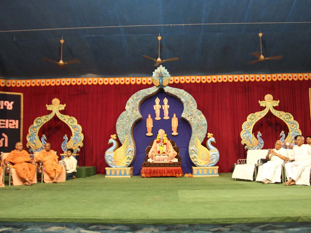 On this auspicious day nearly 20,000 devotees get darshan, blessing and prasad every year. The day was celebrated at night. P.P.Swamiji, Saints and devotees offered Arti five times to Lord and Gunatitanand Swami. Thus they pay their homage for Gunatitanandswami