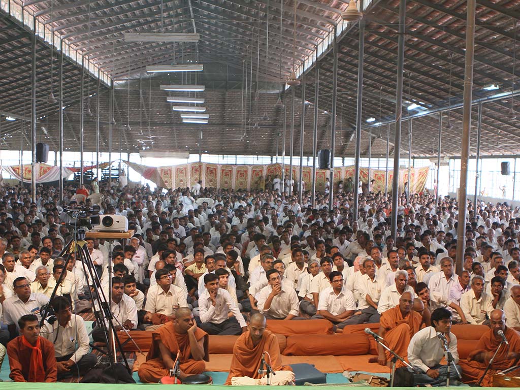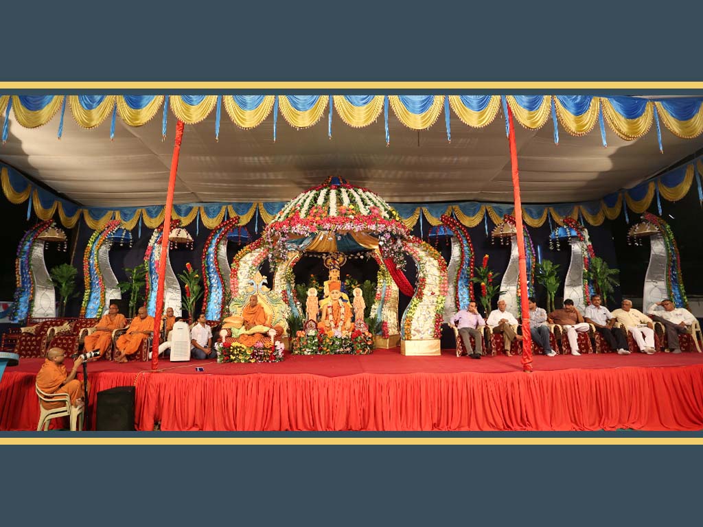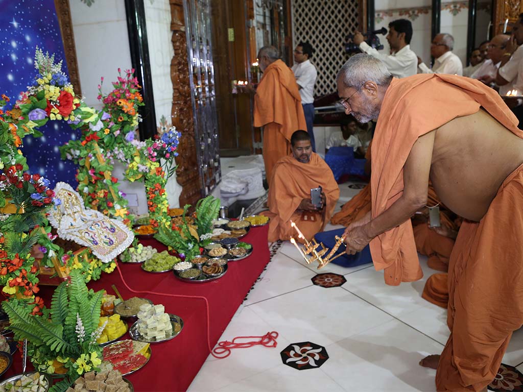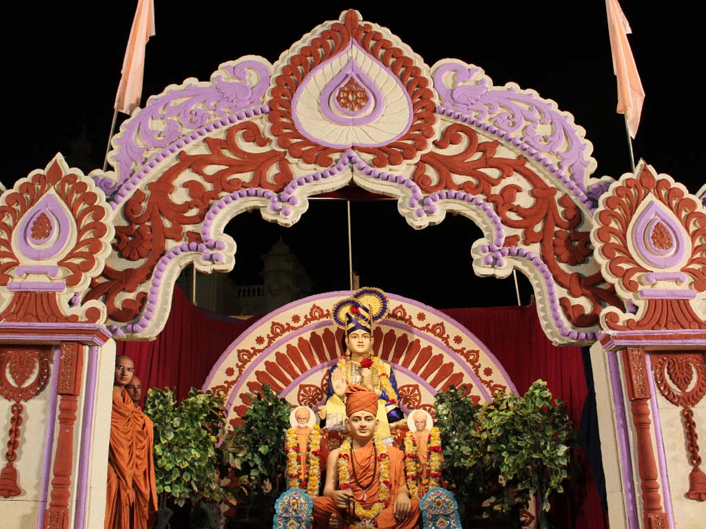 On this auspicious day nearly 20,000 devotees get darshan, blessing and prasad every year. The day was celebrated at night. P.P.Swamiji, Saints and devotees offered Arti five times to Lord and Gunatitanand Swami. Thus they pay their homage for Gunatitanandswami